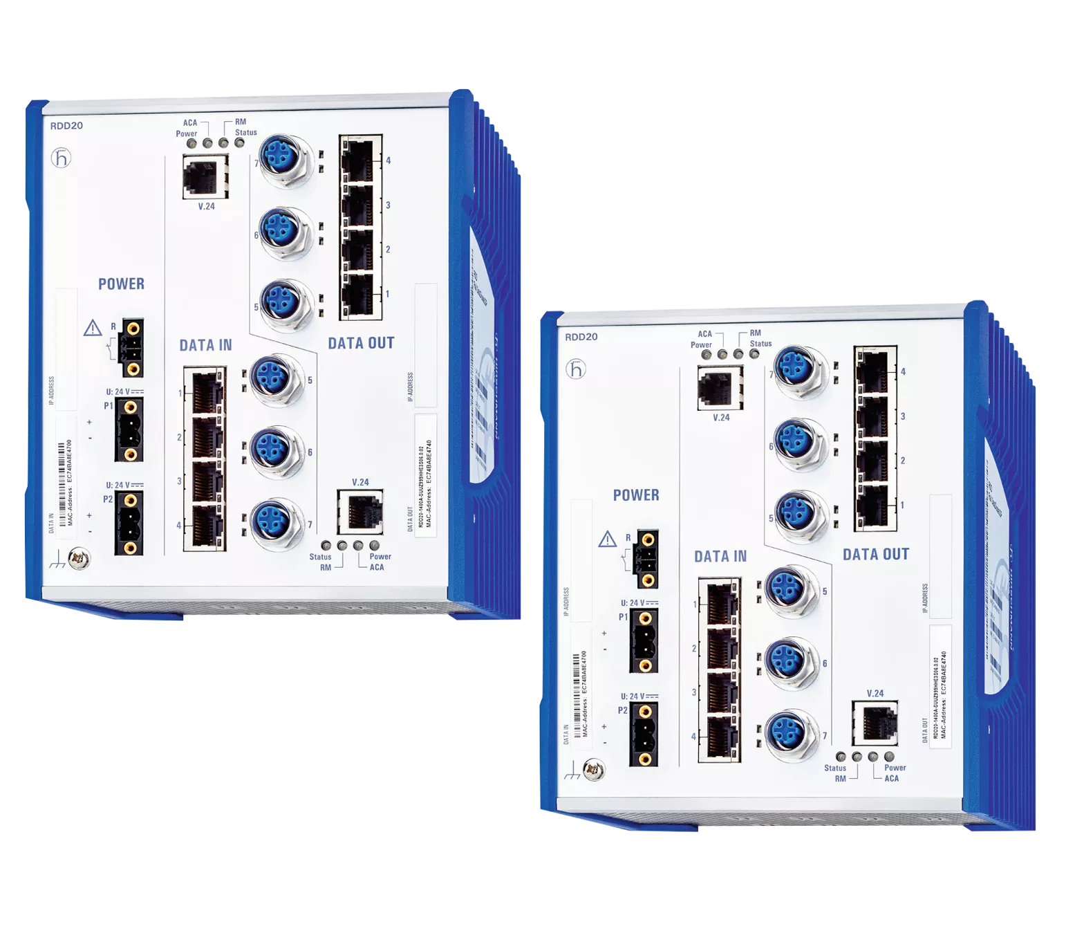 The RDD20 devices consist of 2 independent DATA IN and DATA OUT routers. Within the device there is a continuous unidirectional data connection (100Mbit/s) from DATA IN to DATA OUT for the data transmission. Due to the security requirements, data transmission is only possible from DATA IN to DATAOUT. Data Diode for 24 V operating voltage