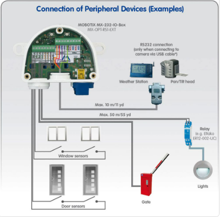 Weatherproof connection of external sensors and switching of external devices via MOBOTIX cameras • Connection to camera using USB or MxBus • 2 self-powered inputs for connecting sensors • 2 outputs: 1 powered output, 1 isolated relay output (can be switched to second powered output) • RS232 interface when using MOBOTIX USB cable to connect to camera • Protection class IP65, -30 to 60°C / -22 to 140°F • Box can be mounted safely out of reach in the wall mounts of M1x, M2x, D1x and D2x